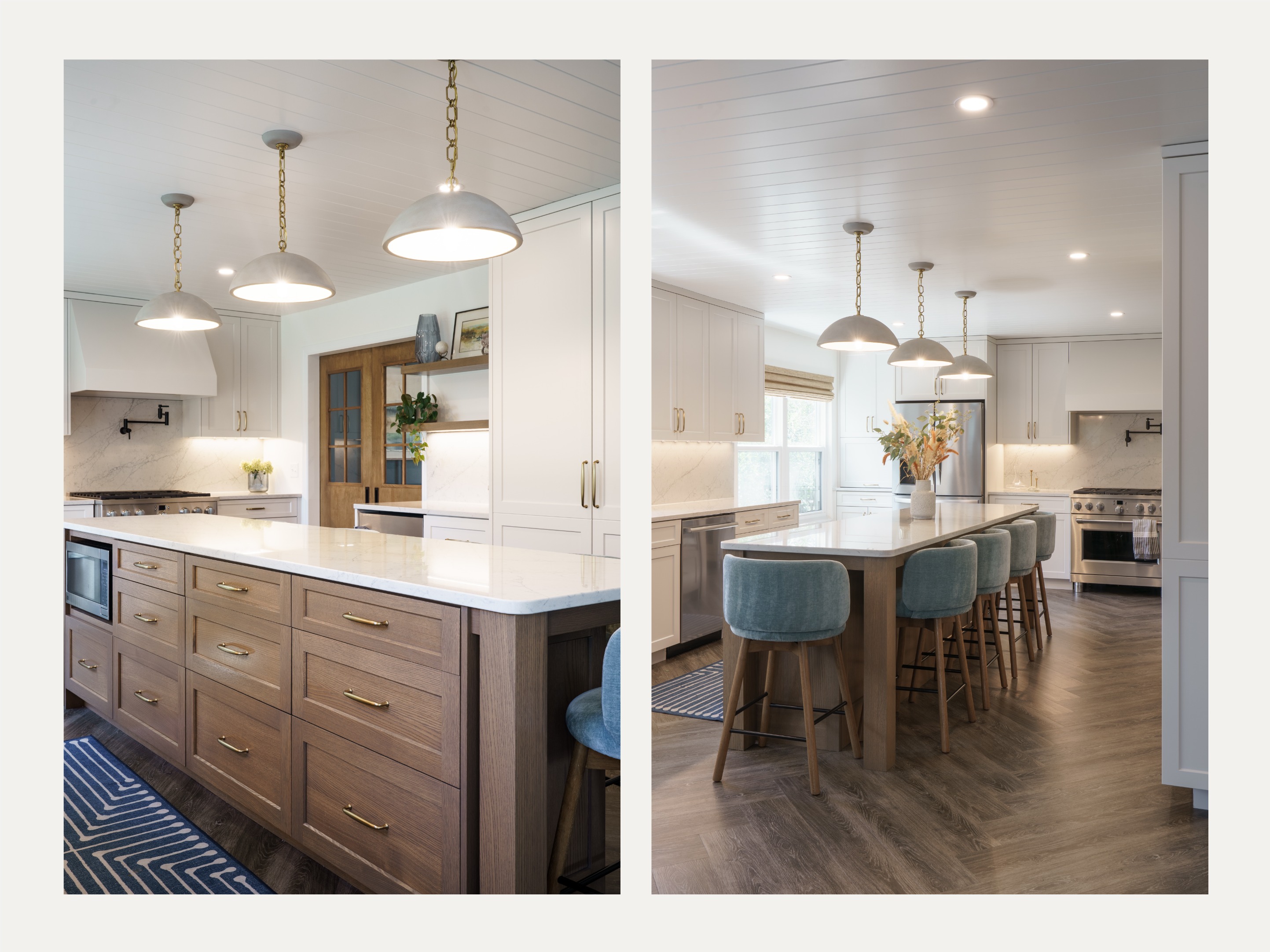 First-floor renovation expands kitchen & flow, blending openness, function & serene ocean-inspired design.